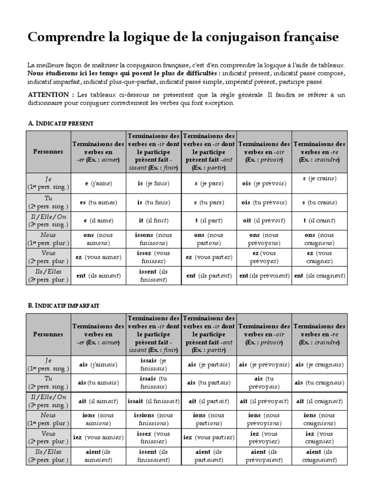 Lune des principales difficultés de la conjugaison française est de savoir quand etCondensé de cours dORTHOGRAPHE en 40 règles. Comprendre la logique de la conjugaison française La meilleure façon de maîtriser la conjugaison française cest den comprendre la logique à laide de tableaux. Comment se forment les modes et les temps dun verbe et quel est leur emploi.
