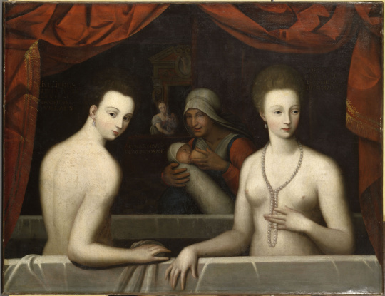 Cette huile sur panneau de chêne est conservée depuis 1937 au musée du Louvre qui la acheté à la collection de M me Goubert de Guestre 2. It is kept at the Louvre in Paris and is usually thought to be the work of a painter from the Fontainebleau School. Gabrielle dEstrées 1571-1599 favorite du roi Henri IV 1553-1610 et sans doute une de ses soeurs la duchesse de Villars ou la maréchale de Balagny.