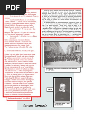 Sur Une Barricade Victor Hugo Page 1 sur 50 - Environ 500 essais Analyse et Paragraphe Argumentatif sur La Barricade de Victor Hugo des Misérables 827 mots 4 pages Texte dentrainement. Sur une barricade au milieu des pavés Les références. Sur une barricade Sur une barricade au milieu des pavés Souillés dun sang coupable et dun sang pur lavés Un enfant de douze ans est pris avec des hommes.